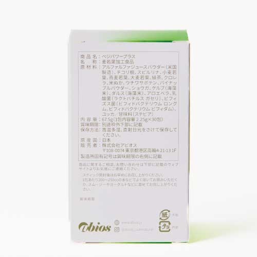 アルファルファジュースパウダー、チコリ根、スピルリナ、小麦若葉、燕麦若葉、大麦若葉、緑茶、クロレラ、米ぬか、ウチワサボテン、パイナップルパウダー、ショウガ、ケルプ(海藻エキス)、ダルス(海藻エキス)、アロエベラ、乳酸菌(ラクトバチルス ガセリ、ビフィドバクテリウム ロングム、ビフィドバクテリウム ビフィダム)、ユッカ、甘味料(ステビア)
