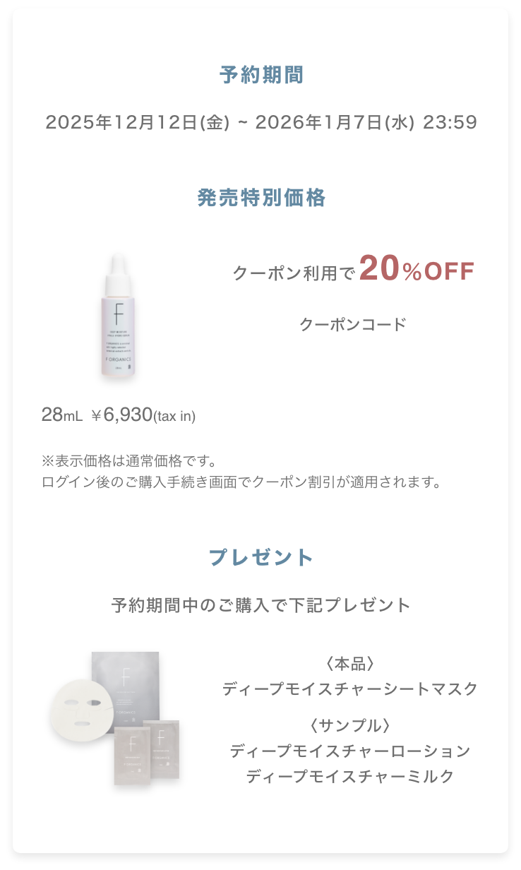 RECOMMEND HOW TO USE ディープモイスチャー ヒアルハイドロセラム 与えても満たされないハリ不足肌へ、力強いハリを。 水をほぼ使わずオーガニック美容水※2を ベースに、先進のバイオサイエンスが生み出した 美容成分を厳選配合。 ひと塗りで潤い広がるハリ、 使うたびに押し返すようなハリの予感で 満たされる美容液です。 ※2ダマスクバラ花水、アロエベラ液汁(どちらも保湿) 発売特別価格 先行予約はこちら ※予約期間:2025年12月12日(金)~2026年1月7日(水) RECOMMEND こんな方におすすめ 肌のハリ不足が気になる 保湿だけでなくエイジングケア※3もしたい メイクをしても肌にツヤが出にくい 水系の保湿セラムを探している ※3年齢に応じたケア HOW TO USE 使用方法 Step 1化粧水後、適量(2~3滴)手に取る。 Step 2両手のひらで温めてから顔全体を包み込み引き上げるようにのばす。 Step 3そのあと乳液・クリームを重ねる。 PRE-ORDER 先行予約特典 FOSERUM20Copy コピーできました! 関連商品 化粧水 ディープモイスチャー ローション150mL 通常価格 ¥4,180(tax in) 定期価格 ¥2,170(tax in)※ ※初回価格 2回目以降¥3,344(tax in) ※定期便はF ORGANICS公式サイトのみ 乳液 ディープモイスチャー ミルク120mL 通常価格 ¥4,180(tax in) 定期価格 ¥3,344(tax in)※ ※定期便はF ORGANICS公式サイトのみ 洗顔料 ディープモイスチャー フォーミングウォッシュ150mL 通常価格 ¥3,520(tax in) 定期価格 ¥2,816(tax in)※ ※定期便はF ORGANICS公式サイトのみ メイク落とし ディープモイスチャー クレンジングクリーム150g 通常価格 ¥4,180(tax in) 定期価格 ¥3,344(tax in)※ ※定期便はF ORGANICS公式サイトのみ メイク落とし ディープモイスチャー スキンオイル20mL 通常価格 ¥5,720(tax in) 定期価格 ¥4,576(tax in)※ ※定期便はF ORGANICS公式サイトのみ クリーム ディープモイスチャー クリーム40g 通常価格 ¥5,170(tax in) 定期価格 ¥4,136(tax in)※ ※定期便はF ORGANICS公式サイトのみ シートマスク ディープモイスチャー シートマスク 1枚 / ¥800(tax in) 4枚 / ¥3,300(tax in) 先行予約特典 20%OFFクーポン