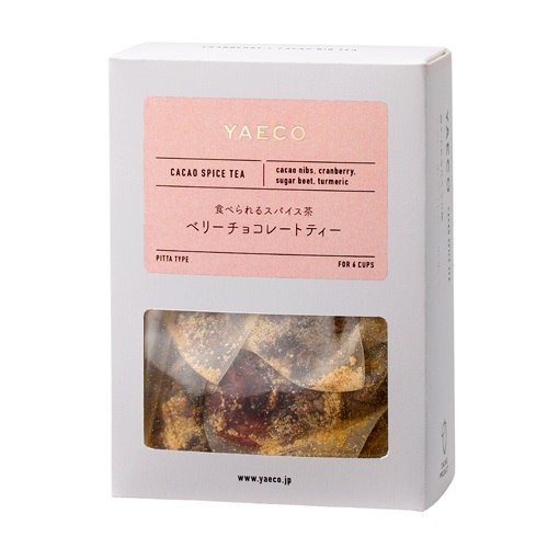 アーユルヴェーダの視点から、カラダに美味しいカカオと、心に美味しいハーブとスパイスをブレンドした”カラダを整えるカカオティー”。クランベリーとカカオの甘い香りに、ターメリックのピリッとした刺激がアクセント。キレイな血液へと導くものを選びました。お茶の後、具材もおいしく食べられます。