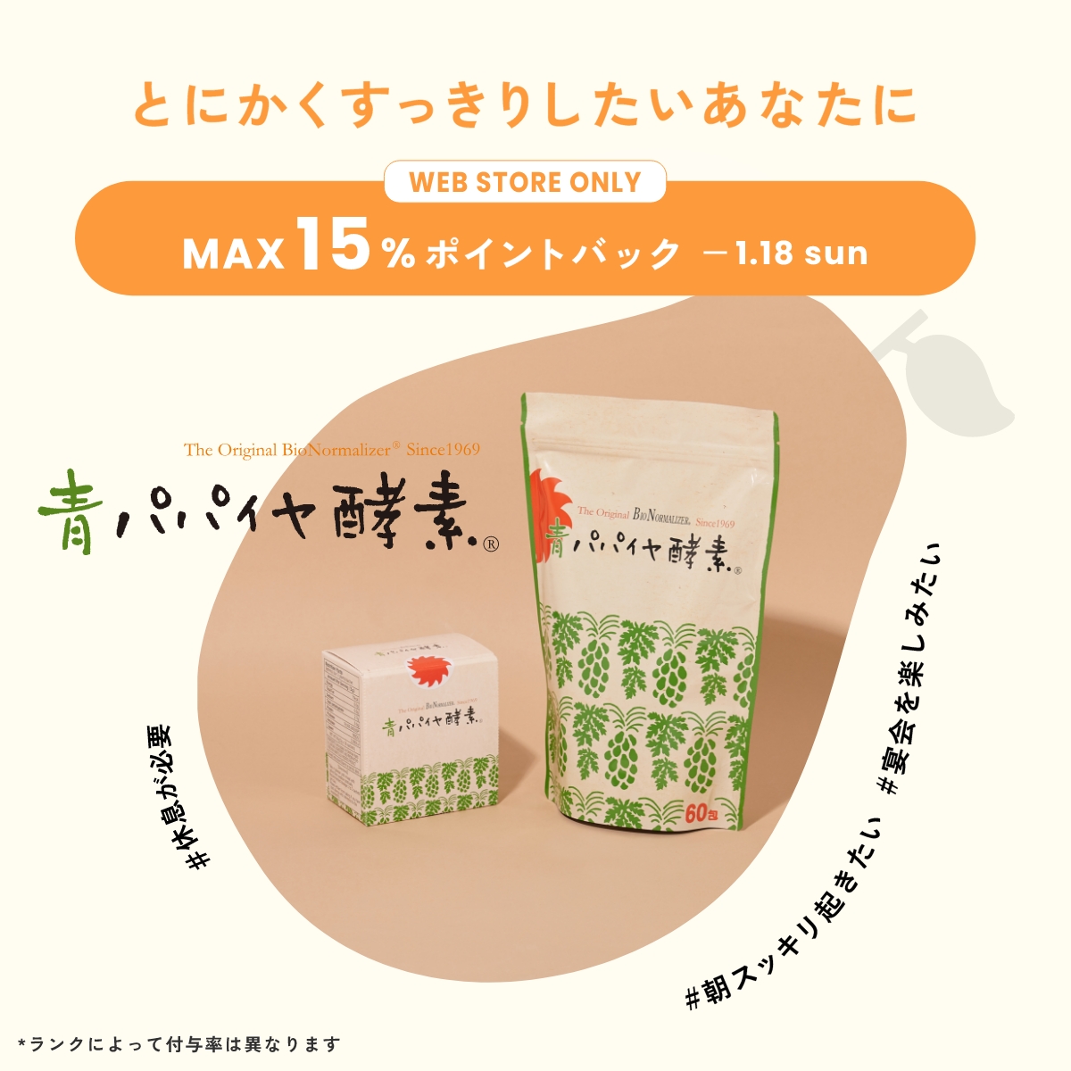 CAMPAIGN 青パパイヤ酵素って何が良いの? 今だけの限定セットをチェック! ベストな飲み方がわかる!お疲れ度診断 スタッフ&お客さまレビュー 飲み方講座Q&A 青パパイヤ酵素ALLラインナップ WEB STORE ONLYCAMPAIGN 2025.12.19 Fri. 10:00 ー 2026.1.18 Sun. 23:59 期間中、青パパイヤ酵素の商品をご購入で 最大15%*ポイントバック! *会員ランクによってポイント付与率は異なります。*一部対象外の商品がございます。 顆粒タイプ Granules type line up 30包(約1か月分※1) 1包あたり¥227※2 ¥6,804(税込) 数量 1 2 3 4 5 カートに入れる NEW 60包(約2か月分※1) 1包あたり¥180※2 ¥10,800(税込) 数量 1 2 3 4 5 カートに入れる ※1 日数の目安は1日1包飲む場合※2 すべて税込価格 EXタブレットタイプ EX Tablet type line up トライアル30粒(約1週間分※) ¥864(税込) 数量 1 2 3 4 5 カートに入れる ボトル120粒(約1か月分※) ¥3,240(税込) 数量 1 2 3 4 5 カートに入れる 大容量360粒(約3か月分※) ¥7,776(税込) 数量 1 2 3 4 5 カートに入れる ※日数の目安は1日4粒飲む場合 スキンケア Skin Care シートマスク シートマスク パパイン / ナイアシンアミド / バクチオール / 酒粕エキス / ヒアルロン酸Na ¥495(税込) 数量 1 2 3 4 5 カートに入れる 家食 Taking in カカオバー(1本) ¥356(税込) 数量 1 2 3 4 5 カートに入れる 抹茶バー(1本) ¥356(税込) 数量 1 2 3 4 5 カートに入れる カカオベリーバー(1本) ¥356(税込) 数量 1 2 3 4 5 カートに入れる ココキャラメルバー(1本) ¥356(税込) 数量 1 2 3 4 5 カートに入れる 野菜スープ ¥1,296(税込) 数量 1 2 3 4 5 カートに入れる 何かと忙しい年末年始 こんなお悩みはありませんか? 乱れた食生活を正したい 環境の変化で、体がもやもやする 最近リフレッシュできていない 連休明け、忙しくて生活習慣が乱れてきた 翌朝すっきりしない 毎日の食事を思い切り楽しみたい スッキリとした目覚めの朝を過ごしたい 大事な予定の前のお守りアイテムが欲しい 1つでも当てはまる方は、“青パパイヤ酵素”をぜひ試してみて! TOPICS 青パパイヤ酵素って何が良いの? 今だけの限定セットをチェック! ベストな飲み方がわかる!お疲れ度診断 スタッフ&お客さまレビュー 飲み方講座Q&A 青パパイヤ酵素ALLラインナップ 青パパイヤ酵素って何が良いの? 酵素は、日々のカラダのサイクルに必要不可欠。 特に青パパイヤに含まれる酵素は、 タンパク質、糖質、脂質の3つを分解する希少な食物酵素で、 他の野菜と比べても含有量は一目瞭然! 青パパイヤ酵素で不足しがちな酵素をサポート 食生活の乱れによって消化に酵素を沢山使うと 代謝に使う酵素が追い付かず、 なんだかスッキリできなくなったり、 美容や体のサイクルに影響が出ることも!? 不足しがちな酵素を補うことが大切です。 青パパイヤ酵素を購入する 青パパイヤ酵素ができるまで 品質のこだわり ✓遺伝子組み換えでない ✓オーガニック栽培(USDA・有機JAS認定取得) ✓大人の握りこぶし大の未成熟果は活力を維持するための栄養素が多く含まれている ✓満月に収穫生物の生体と月のリズムに合わせてより元気で良質がよい有機青パパイヤ使用 限定商品をチェック! 1 青パパイヤ酵素 美容家石井美保 限定スペシャルキット ¥16,200(税込) セット内容 顆粒青パパイヤ酵素60包サイズ×2¥21,600※ 青パパイヤ酵素シートマスク×7枚¥3,465※ オリジナルスティックケース ※すべて税込価格 購入する 2 NEW新サイズ(60包)が登場! 顆粒タイプ青パパイヤ酵素 60包サイズ 通常購入価格¥13,608 ¥10,800(税込) 20%OFF 青パパイヤ酵素30包入り ¥6,804※1包あたり¥227※ 60包入り1包あたり¥180※ ¥47お得 ※すべて税込価格 購入する ベストな飲み方がわかる!お疲れ度診断 今のわたしに青パパイヤ酵素ってどれくらい必要?疲労のタイプは? お疲れ度を今すぐチェック! スタッフレビュー ほかのスタッフレビューを見る お客さまの声 ★★★★★ 飲んでいた時と飲み終えた後で朝のスッキリ感や胃腸の調子が違う気がします。胃もたれやなんとなくの不調がなくなり、体調に対するアプローチが幅広く、色んなお悩みを抱えている方に試していただきやすいと感じました。気軽に飲めて味にもクセがないので、今後も飲み続けたいと思います。 momo ★★★★★ 日に日にお腹の調子が良くなっていくのが体感できました。飲む時間が自由でいいのに、効果を感じられるところがお気に入りです。味も飲みやすくてお腹のリズムが整うから、健康になりたいけど、何を飲んで良いか分からない人はオススメです! N ★★★★ 飲んで10分後に消化がはじまります!味もおいしく水無しで飲めて手軽に取り入れられます。油ものを気にせず食べたい人、便通が安定しない人にぜひ試してほしいです。 natsu ★★★★ 味も美味しくて、我慢して飲むということがないです。粉末タイプは水なしでも飲めるし、個装で量もちょうどいい!朝すっきり起きれるようになったり、胃がもたれにくくなったりと効果も実感できました。食生活が不規則な人はご飯が遅くなった時、寝るまで時間がない時に飲むとよいと思います。 
