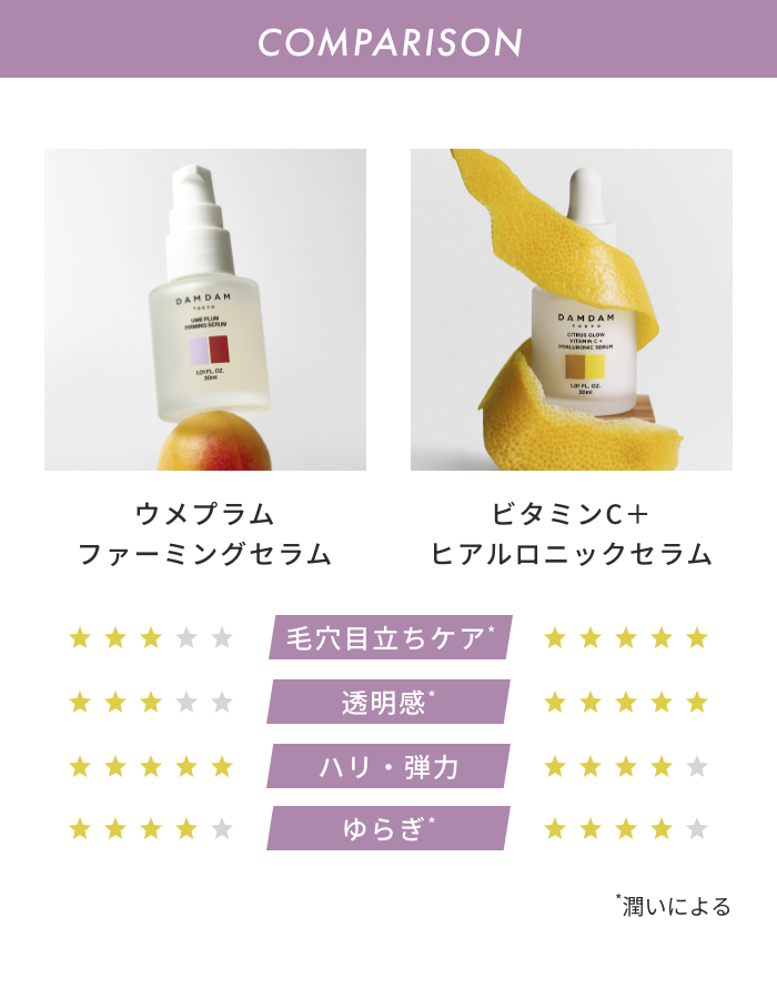 生き生きとしたふっくらハリ肌へと導くウメファーミングセラムは、たるみなどのエイジングサインや黄ぐすみなど、肌に元気がないというお悩みをお持ちの方におすすめです。みずみずしい透明感を与えてくれるビタミンC+ヒアルロニックセラムは、紫外線によるくすみ、乾燥ダメージが気になる方におすすめです。
