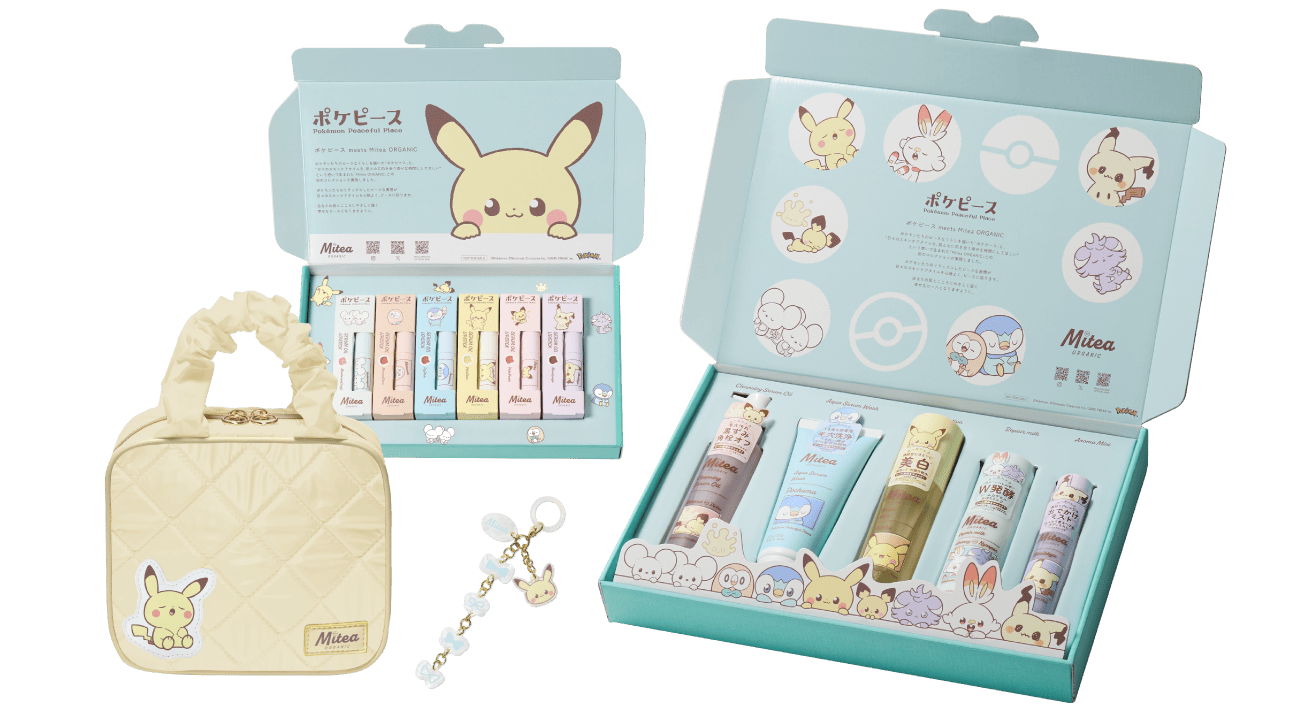 ミニサイズセット アロマミスト クレンジングセラムオイル アクアセラムウォッシュ ホワイトニングセラムローション リペアミルク セラムオイルリップスティック Special Campaign All Item Check ©Pokémon. ©Nintendo/Creatures Inc./GAME FREAK inc. ポケピース meets Mitea ORGANIC ポケモンたちのピースなくらしを描いた「ポケピース」と、 “日々のスキンケアタイムを、肌と心に向き合う幸せな時間にしてほしい” という想いで生まれた「Mitea ORGANIC」との、 初のコレクションが実現しました。 ポケモンたちのリラックスしたピースな表情が 日々のスキンケアタイムを心地よく、ピースに彩ります。 あなたの肌とこころにやさしく届く 幸せなピースとなりますように。 Schedule 2025年10月07日(火) 予約開始 2025年10月21日(火) 発売開始 Special Kit Minisize Kit 数量限定 Mitea ORGANICミニサイズセット ¥1,650 BUY 人気のクレンジングオイルとオールインワンでも使えるミルクが約2週間分のミニサイズになった、ポーチ付き数量限定セット。 # まずは試したい # 毛穴汚れ # オールインワンケア ポケピースデザインポーチ W135mm×H130m×40mm クレンジングセラムオイル 30ml・φ28×92mm リペアミルク 20ml・W40mm×H108mm×28mm Product Details Aroma Mist アロマミスト(ヘア&ボディミスト) 40ml¥1,320 BUY 気になるにおいをリセットし髪と体のうるサラを叶える、レスキューアロマミスト。 # においケア # うるおい・ツヤ # ヘア&ボディ # サラサラ・まとまる # 静電気防止 # フレグランスミスト 天然由来香料夜想ブルームブーケの香り 月明かりの下、ひっそりと花開くブーケのような甘すぎないフローラルノート。 香水の香りを邪魔をせずにふんわりと香るナチュラルでリュクスな香り。 植物由来清浄成分カキタンニン配合 悪臭の原因であるノネナールをケアし、外出先で付いたにおいをリフレッシュ。 髪と肌それぞれにフォーカスした植物成分 トウモロコシタンパクエキス(保湿) アロエベラ葉エキス(保湿) うるサラを叶える成分を配合。髪には指通りを、肌にはうるおいを与える成分でひと吹きで理想の髪と肌へ。 read more × close Cleansing Oil クレンジングセラムオイル 120ml¥1,848 BUY オーガニック×美容オイルの力で、毛穴の角栓・黒ずみ*1まですっきりオフする、W洗顔不要のクレンジングオイル。 # 角栓・黒ずみ*1オフ # 濡れた手でOK # W洗顔不要 # マツエクOK*2 Face Wash アクアセラムウォッシュ 100ml¥1,188 BUY オーガニック×マリンクレイ*3×竹炭*4の力で毛穴汚れを吸着・洗浄し、ふっくらみずみずしい肌に導く美容液洗顔料。 # 毛穴洗浄 # クレイ*3×炭*4 # 弾力ミクロ泡 # キメふっくら Serum Lotion ホワイトニングセラムローション医薬部外品 (販売名:ミティア セラムL) 120ml¥1,991 BUY オーガニック×植物性持続型ビタミンC*5の力で、透明感*6あふれるいきいきとした肌に導くしっとりとろみ感触の美白*7ローション。 # 美白*7 # 保湿 # 透明感*6 Repair Milk リペアミルク 100ml¥1,991 BUY 荒れた肌にも独自のW発酵ソームカプセルが角層深くまで浸透*8。ハリ・透明感*6のある肌へ。オールインワンでも使える高保湿乳液。 # オールインワンケア # ハリ・うるおい # 透明感*6 # 肌のお守りミルク セラムオイルリップスティック 全6色¥995 BUY NEW NEW NEW 06 カミナリクリア (透明タイプ) 07 チュチュピンク (発色タイプ) 08 フェアリーレンガ (発色タイプ) 01 マンダリーヌコンフィ (透明タイプ) 02 マロングラッセ (発色タイプ) 05 ピグピンク (発色タイプ) オーガニック×美容オイルの力で、うるおいを閉じ込め、色もちUP! カラリストと作り上げた、肌をきれいに見せる洒落感カラーのリップティック。 Special Campaign ポケピース meets Mitea ORGANICPeaceful GiftCampaign ポケピース meets Mitea ORGANIC製品をご購入いただいた方の中から、抽選で合計700名様にオリジナルグッズをプレゼント! 応募期間2025年10月21日(火) ~ 2025年12月31日(水) A賞 スキンケアラインナップ入り特別BOX 50名様 B賞 リップラインナップ入り特別BOX 50名様 C賞 スキンケアもリップも入るビッグポーチ 300名様 D賞 リップチャーム 300名様 ※商品画像はサンプルのためイメージです。色味やサイズ等の仕様に変更がある場合がございますので、予めご了承ください。 ※ポーチとリップチャームにスキンケアやリップ等の製品は付属しません。 応募方法 1 販売されているポケピース meets Mitea ORGANICの製品を購入 2 お買い上げレシートの写真または購入履歴画面のスクリーンショットを応募フォームにアップロード 3 必要情報を入力し応募完了! 応募フォーム ※10月21日(火)午前10時よりご応募可能となります。 ※10/7(火)~12/31(水)期間中のポケピース meets Mitea ORGANIC製品の購入が対象となります。 ※応募期間は10/21(火)~12/31(水)23:59となります。 ※購入対象はポケピース meets Mitea ORGANIC製品すべてが対象となります。 ※一部取り扱いのない店舗がございます。 ※ファミリーマートは店舗販売のみです。 応募方法をチェック! × close ポケピースとは? 世界のどこかにある、ちいさなまち。 ポケモンとにんげん