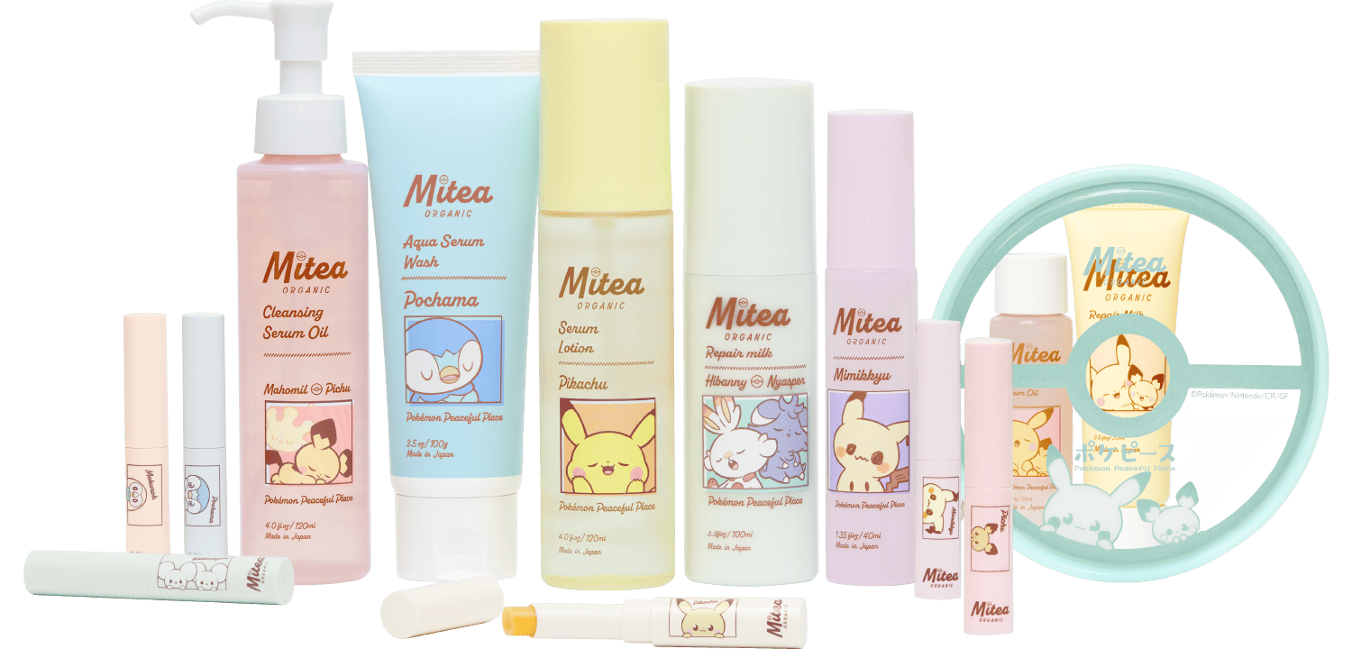 ミニサイズセット アロマミスト クレンジングセラムオイル アクアセラムウォッシュ ホワイトニングセラムローション リペアミルク セラムオイルリップスティック Special Campaign All Item Check ©Pokémon. ©Nintendo/Creatures Inc./GAME FREAK inc. ポケピース meets Mitea ORGANIC ポケモンたちのピースなくらしを描いた「ポケピース」と、 “日々のスキンケアタイムを、肌と心に向き合う幸せな時間にしてほしい” という想いで生まれた「Mitea ORGANIC」との、 初のコレクションが実現しました。 ポケモンたちのリラックスしたピースな表情が 日々のスキンケアタイムを心地よく、ピースに彩ります。 あなたの肌とこころにやさしく届く 幸せなピースとなりますように。 Schedule 2025年10月07日(火) 予約開始 2025年10月21日(火) 発売開始 Special Kit Minisize Kit 数量限定 Mitea ORGANICミニサイズセット ¥1,650 BUY 人気のクレンジングオイルとオールインワンでも使えるミルクが約2週間分のミニサイズになった、ポーチ付き数量限定セット。 # まずは試したい # 毛穴汚れ # オールインワンケア ポケピースデザインポーチ W135mm×H130m×40mm クレンジングセラムオイル 30ml・φ28×92mm リペアミルク 20ml・W40mm×H108mm×28mm Product Details Aroma Mist アロマミスト(ヘア&ボディミスト) 40ml¥1,320 BUY 気になるにおいをリセットし髪と体のうるサラを叶える、レスキューアロマミスト。 # においケア # うるおい・ツヤ # ヘア&ボディ # サラサラ・まとまる # 静電気防止 # フレグランスミスト 天然由来香料夜想ブルームブーケの香り 月明かりの下、ひっそりと花開くブーケのような甘すぎないフローラルノート。 香水の香りを邪魔をせずにふんわりと香るナチュラルでリュクスな香り。 植物由来清浄成分カキタンニン配合 悪臭の原因であるノネナールをケアし、外出先で付いたにおいをリフレッシュ。 髪と肌それぞれにフォーカスした植物成分 トウモロコシタンパクエキス(保湿) アロエベラ葉エキス(保湿) うるサラを叶える成分を配合。髪には指通りを、肌にはうるおいを与える成分でひと吹きで理想の髪と肌へ。 read more × close Cleansing Oil クレンジングセラムオイル 120ml¥1,848 BUY オーガニック×美容オイルの力で、毛穴の角栓・黒ずみ*1まですっきりオフする、W洗顔不要のクレンジングオイル。 # 角栓・黒ずみ*1オフ # 濡れた手でOK # W洗顔不要 # マツエクOK*2 Face Wash アクアセラムウォッシュ 100ml¥1,188 BUY オーガニック×マリンクレイ*3×竹炭*4の力で毛穴汚れを吸着・洗浄し、ふっくらみずみずしい肌に導く美容液洗顔料。 # 毛穴洗浄 # クレイ*3×炭*4 # 弾力ミクロ泡 # キメふっくら Serum Lotion ホワイトニングセラムローション医薬部外品 (販売名:ミティア セラムL) 120ml¥1,991 BUY オーガニック×植物性持続型ビタミンC*5の力で、透明感*6あふれるいきいきとした肌に導くしっとりとろみ感触の美白*7ローション。 # 美白*7 # 保湿 # 透明感*6 Repair Milk リペアミルク 100ml¥1,991 BUY 荒れた肌にも独自のW発酵ソームカプセルが角層深くまで浸透*8。ハリ・透明感*6のある肌へ。オールインワンでも使える高保湿乳液。 # オールインワンケア # ハリ・うるおい # 透明感*6 # 肌のお守りミルク セラムオイルリップスティック 全6色¥995 BUY NEW NEW NEW 06 カミナリクリア (透明タイプ) 07 チュチュピンク (発色タイプ) 08 フェアリーレンガ (発色タイプ) 01 マンダリーヌコンフィ (透明タイプ) 02 マロングラッセ (発色タイプ) 05 ピグピンク (発色タイプ) オーガニック×美容オイルの力で、うるおいを閉じ込め、色もちUP! カラリストと作り上げた、肌をきれいに見せる洒落感カラーのリップティック。 Special Campaign ポケピース meets Mitea ORGANICPeaceful GiftCampaign ポケピース meets Mitea ORGANIC製品をご購入いただいた方の中から、抽選で合計700名様にオリジナルグッズをプレゼント! 応募期間2025年10月21日(火) ~ 2025年12月31日(水) A賞 スキンケアラインナップ入り特別BOX 50名様 B賞 リップラインナップ入り特別BOX 50名様 C賞 スキンケアもリップも入るビッグポーチ 300名様 D賞 リップチャーム 300名様 ※商品画像はサンプルのためイメージです。色味やサイズ等の仕様に変更がある場合がございますので、予めご了承ください。 ※ポーチとリップチャームにスキンケアやリップ等の製品は付属しません。 応募方法 1 販売されているポケピース meets Mitea ORGANICの製品を購入 2 お買い上げレシートの写真または購入履歴画面のスクリーンショットを応募フォームにアップロード 3 必要情報を入力し応募完了! 応募フォーム ※10月21日(火)午前10時よりご応募可能となります。 ※10/7(火)~12/31(水)期間中のポケピース meets Mitea ORGANIC製品の購入が対象となります。 ※応募期間は10/21(火)~12/31(水)23:59となります。 ※購入対象はポケピース meets Mitea ORGANIC製品すべてが対象となります。 ※一部取り扱いのない店舗がございます。 ※ファミリーマートは店舗販売のみです。 応募方法をチェック! × close ポケピースとは? 世界のどこかにある、ちいさなまち。 ポケモンとにんげん